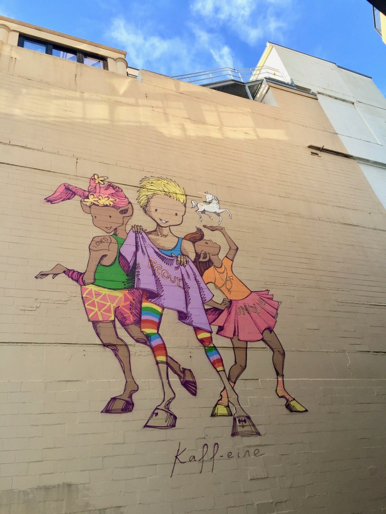 Although all art attempts to communicate, a unique feature of street art is the immediacy of the communication within urban landscapes – not locked away in galleries. One prominent example is Australian female street artist, Kaff-eine, who has an increasing global footprint through her artwork that raises awareness around issues of poverty and LGBTQIA+ communities.