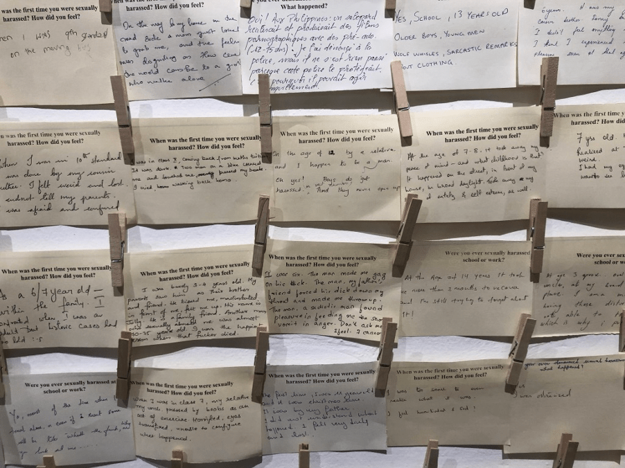 For the Biennale, audiences where asked to specifically write about their experiences and impacts of the floods in Kerela and the earthquake in Mexico. The artist also included a section on the sexual violence against women and asked the audience to contribute.